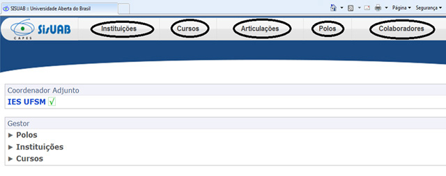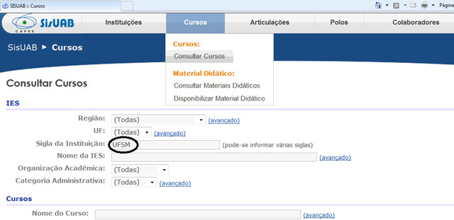 Figura 03 – Dados da Instituição Selecionada/SisUAB Caso você esteja selecionando a sua IES, não é necessário fazer todo esse percurso, descrito anteriormente. Basta acessar a página inicial do SisUAB, e clicar na própria nome da IES (canto superior direito), identificada pelo cadastro do usuário (Figura 01). 2. Cursos da Instituição Seguindo o mesmo itinerário, a próxima opção é consultar os cursos oferecidos pela instituição selecionada. Para isso, você deve colocar o mouse em cima da aba Cursos e então aparecerá as opções da ferramenta (Figura 04)