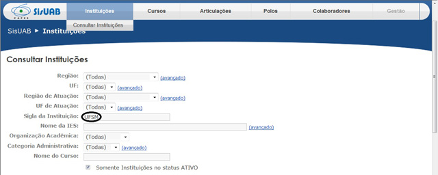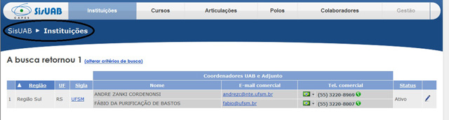 Figura 02 – Ferramenta para Consultar a Instituição/SisUAB Perceba, que de acordo com a Figura 02, não é necessário colocar o nome da instituição por extenso, basta colocar a sua Sigla, e aparecerá os dados do coordenador da UAB e Adjunto, o que facilita a busca (Figura 03).