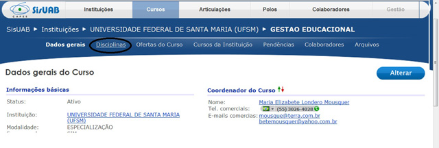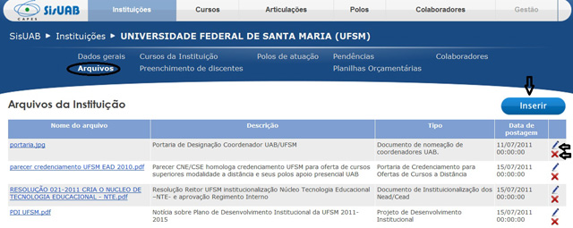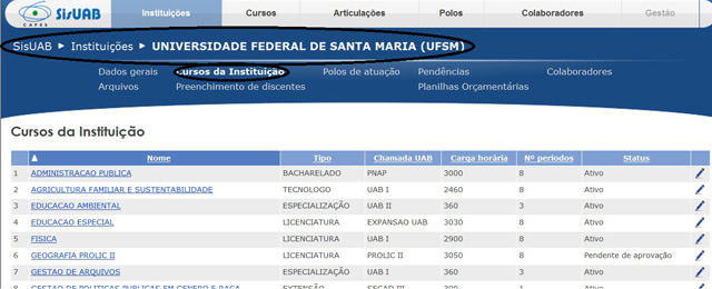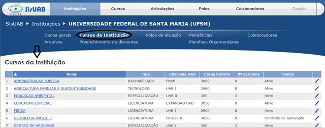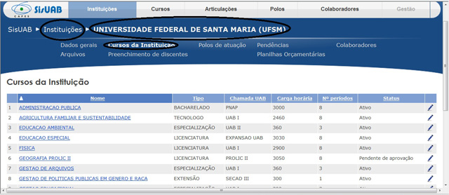 Figura 14 – Arquivos Referente a Instituição Selecionada Ferramentas Referentes aos Cursos da Instituição Conforme comentado no início deste módulo, cada usuário costuma estabelecer um determinado caminho para acessar os dados, na plataforma SisUAB. Primeiramente, procuramos abordar as ferramentas da barra superior, em que pudemos conhecer os recursos disponíveis, especialmente referente a instituição, no caso, a UFSM. Portanto, agora, torna-se de fácil compreensão a busca das informações referentes a cada curso específico. Assim, a Figura 15, nos mostra, novamente, a relação dos Cursos da IES, bem como o Tipo, Chamada UAB, Carga Horária, Número de Períodos, Status, oferecendo ainda a opção de alterar dados gerais do curso.