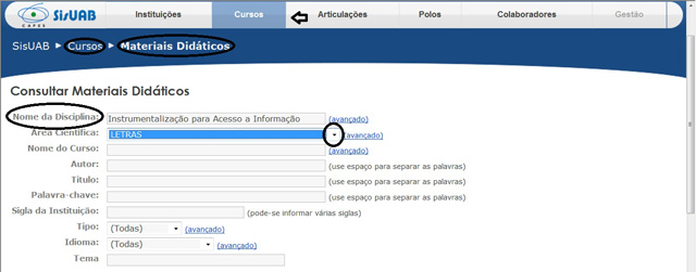 Figura 08 – Exemplo de Consulta de material didático Lembre que a tarefa de postar o material didático cabe a Equipe Multidisciplinar, que também, a partir da autorização da Capes, cadastra o curso. Perceba que dentro do mesmo curso, previamente selecionado, você pode verificar a oferta, ou seja, o Nome dos Polos em que o curso está sendo ofertado (Figura 09).