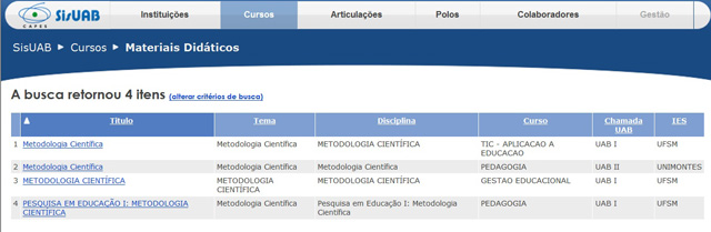 Figura 07 – Exemplo de Consulta Referente ao Material Didático Aparecerá o título da disciplina, o tema, o nome propriamente dito, curso, chamada UAB, IES. Clicando no Título, será possível a consulta (Figura 08).