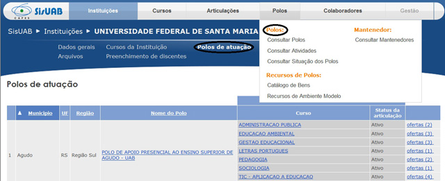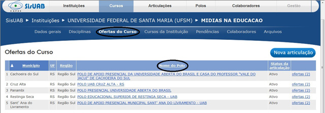 Figura 09 – Exemplo de Consulta Sobre as Ofertas do Curso/ofertas 3. Articulações da Instituição Articulação é a junção de um Curso, pertencente a uma IES, com o Polo de apoio Presencial. Essa articulação se dá por meio de um cadastramento preliminar, o qual ficará pendente de aprovação por parte da CAPES – Coordenação de Aperfeiçoamento de Pessoal de Nível Superior. Uma articulação pode ter uma ou mais ofertas de curso.
