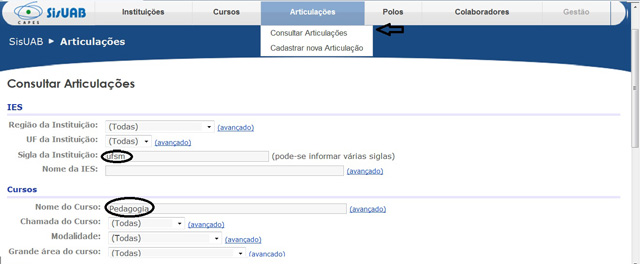 Figura 10 – Exemplo de Consulta sobre Articulações Perceba, de acordo com a Figura 10, que não é necessário completar todos os campos, basta escrever, novamente, a sigla da instituição e o nome do curso, para que o sistema liste as respectivas articulações. Clicando no nome de cada Polo, estará disponível os Dados Gerais, Cursos Ofertados, Colaboradores, Arquivos disponíveis, entre outras informações (Figura 11).