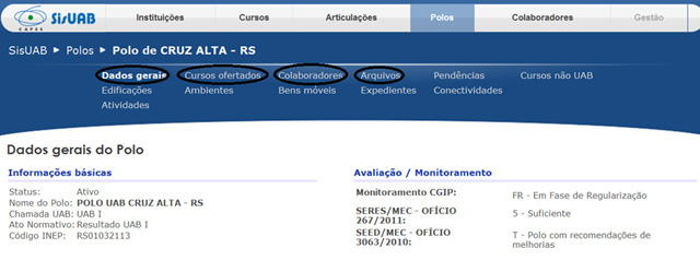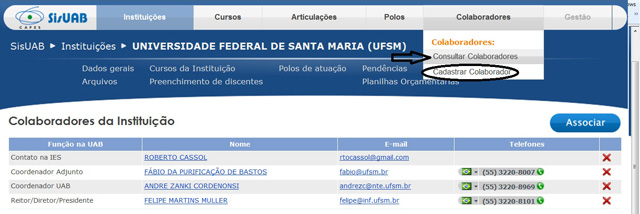 Figura 12 – Polos da Instituição Selecionada Cabe ressaltar que o cadastro de uma nova articulação, segue o mesmo procedimento que para o cadastro dos Cursos, ou seja, tramita pela CAPES e pelo NTE. 5. Colaboradores da Instituição São as pessoas que formam a UAB, por exemplo: Coordenadores UAB, Coordenadores Adjunto, Coordenadores de Curso, Coordenadores de Polo, Técnicos, Tutores, Bibliotecários, etc (Figura 13).